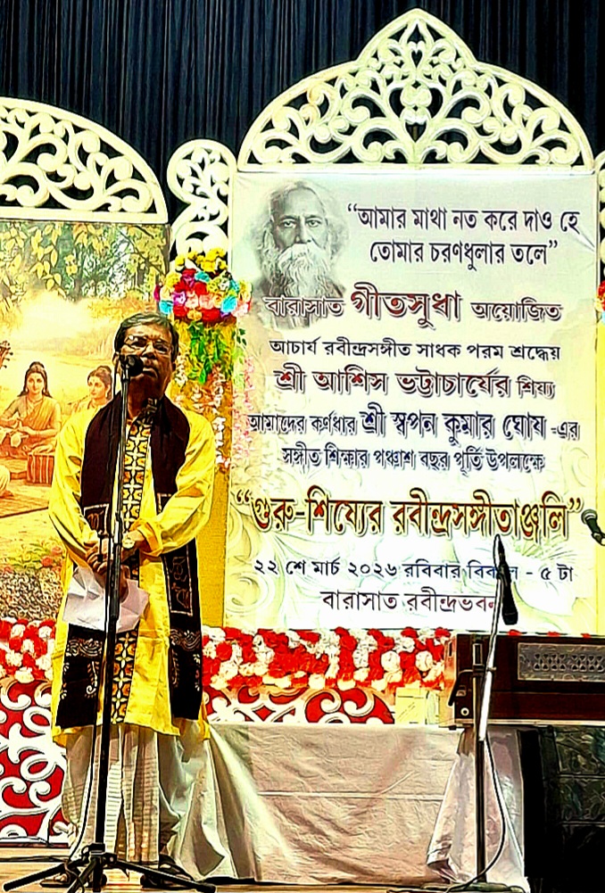 অনুষ্ঠানের তৃতীয় পর্বে শিষ্য ও গীতসুধার শিক্ষক স্বপন কুমার ঘোষের একক সংগীত নিবেদন পূর্ণ প্রেক্ষাগৃহের সমস্ত দর্শককে অনাবিল তৃপ্তিতে ভরিয়ে দেয় । রবীন্দ্র সংগীত প্রিয় বারাসাতবাসীর কাছে শিক্ষক আচার্য আশীষ ভট্টাচার্য মহাশয় এর একক সংগীত নিবেদন ছিল এদিনের রবীন্দ্র সংগীতপ্রেমীদের কাছে এক অন্যরকম পাওনা ।