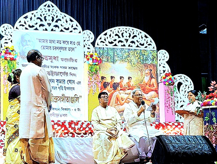 তাঁরই বাল্যবন্ধু , একদা সহকর্মী ও তাঁরই সংগীতের ছাত্র এদিনের সঞ্চালক শিক্ষক সত্যজিৎ ভট্টাচার্যের অনবদ্য ও যথোচিত বক্তব্য সমৃদ্ধ মানপত্র রচনা ও পাঠ যথার্থ গুরুর প্রতি শিষ্যের নিবেদন বলা যায় ।
