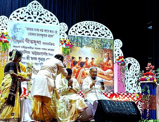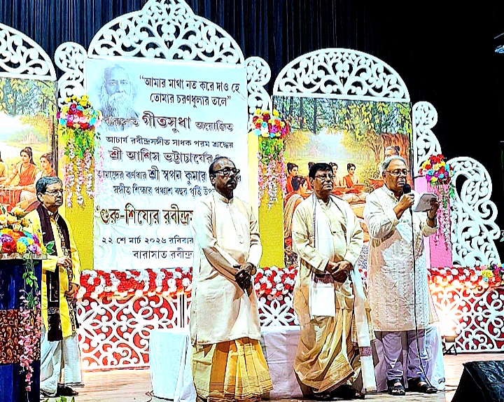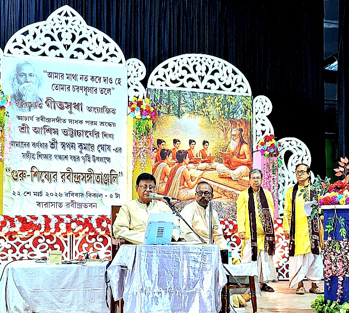 পারফেক্ট টাইম ওয়েব ডেস্ক : “আমার মাথা নত করে দাও হে তোমার চরণধুলার তলে” হ্যাঁ, মাস্টারদা সূর্য সেনের জন্মদিনেই বারাসাত রবীন্দ্রভবনে দুই শিক্ষকের যোগ্য ছাত্র যাকে গুরু শিষ্য সম্পর্ক বলা যেতে পারে তেমনি দুজনের যুগলবন্দীতে অনুষ্ঠিত হলো “গুরু শিষ্যের রবীন্দ্রসংগীতাঞ্জলি”।